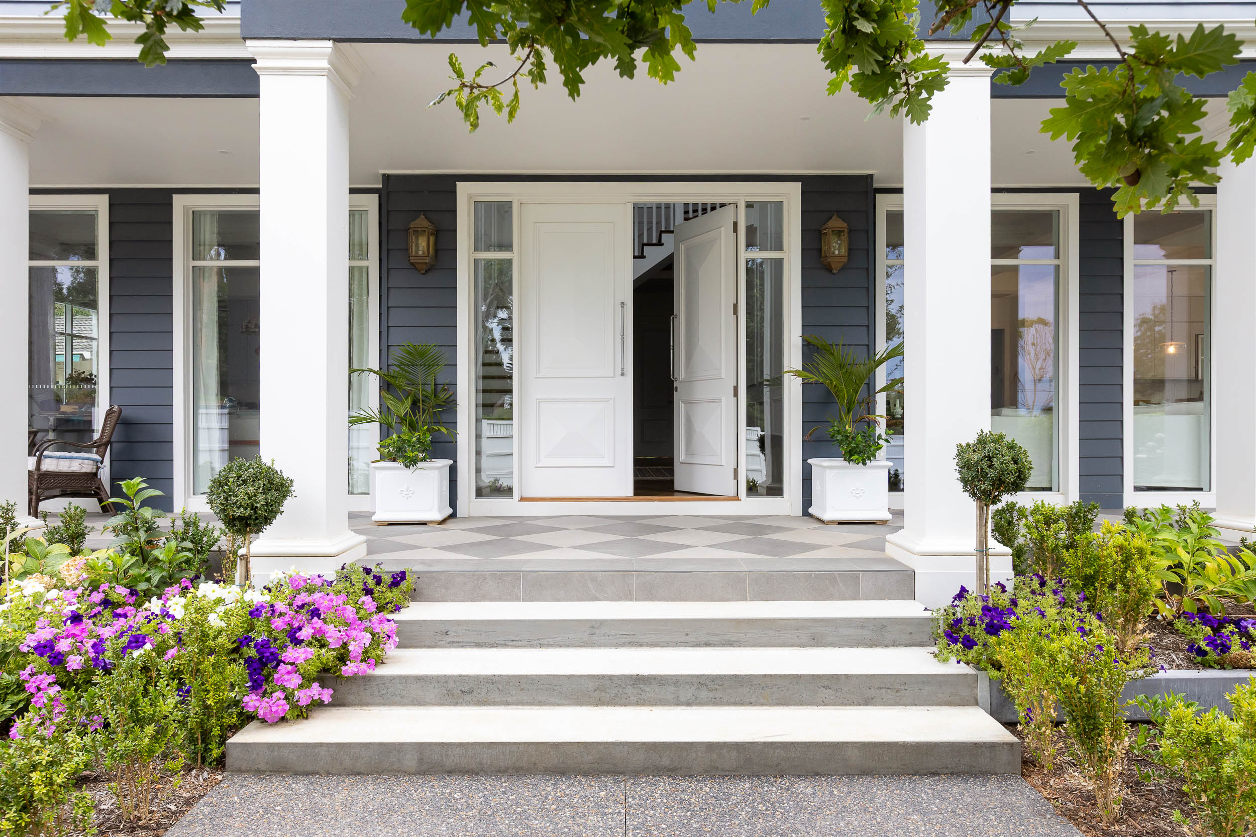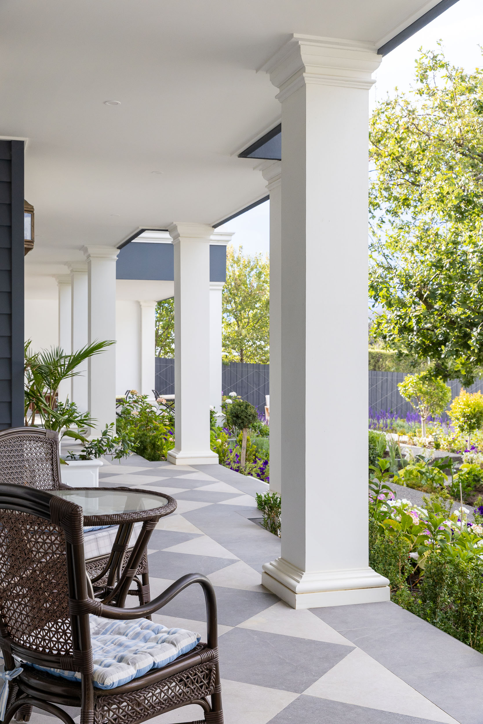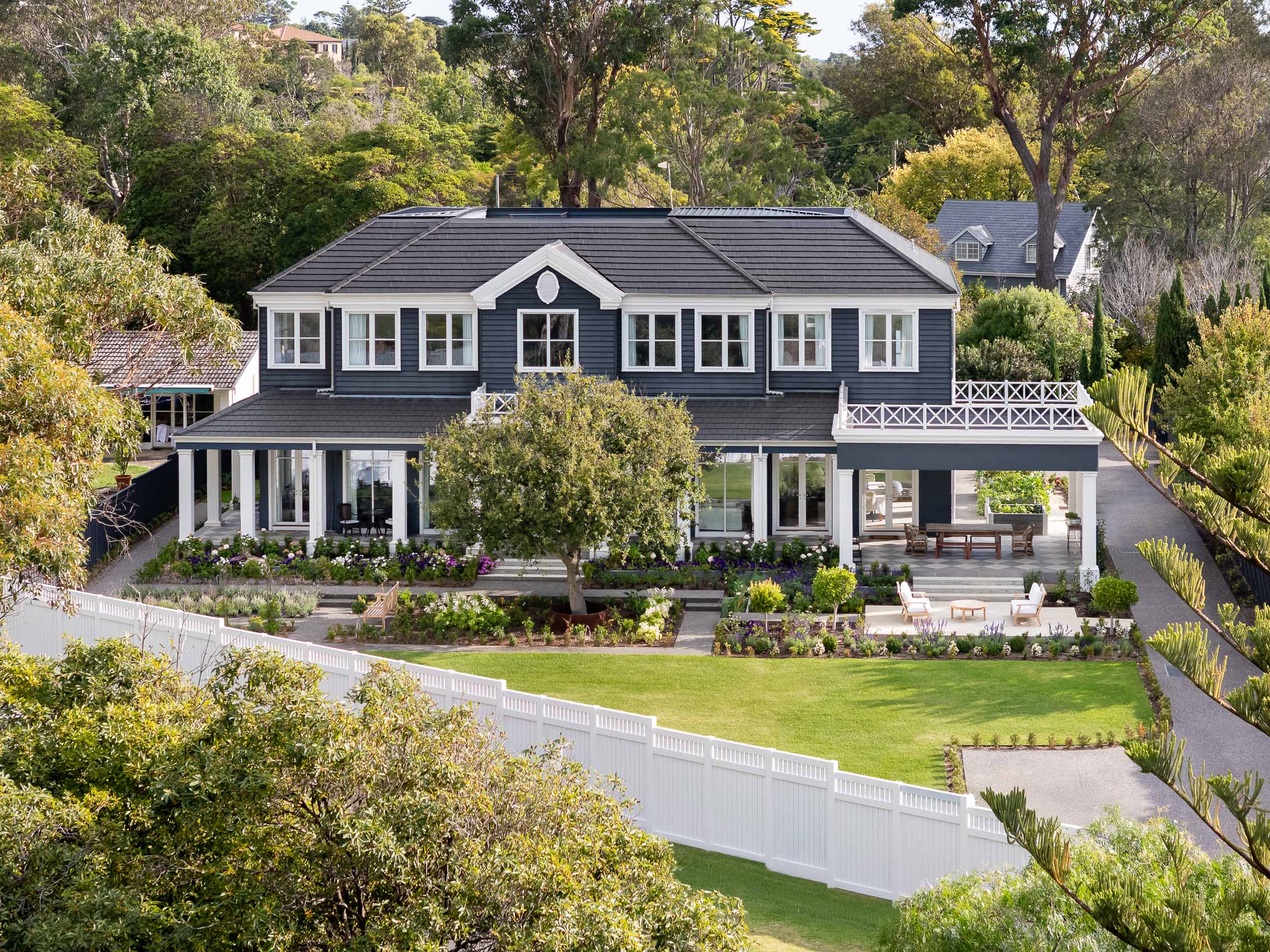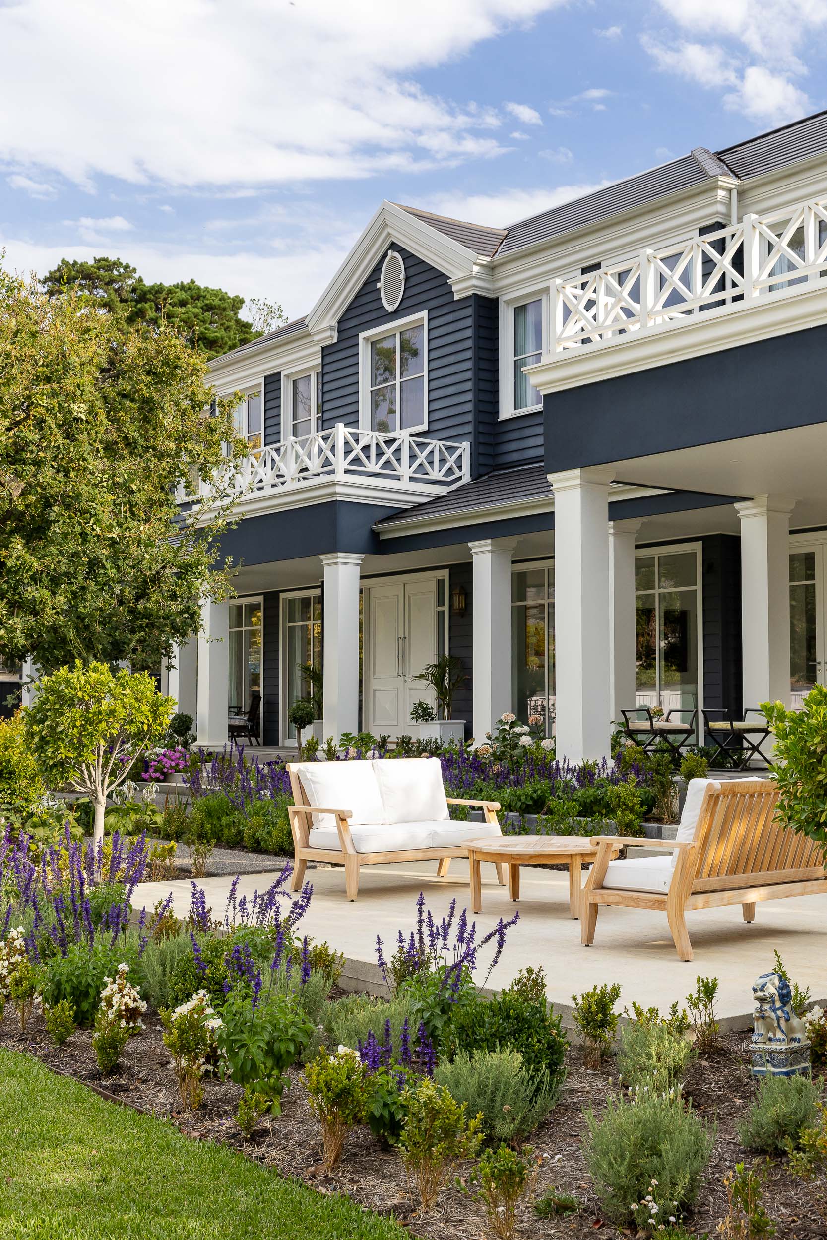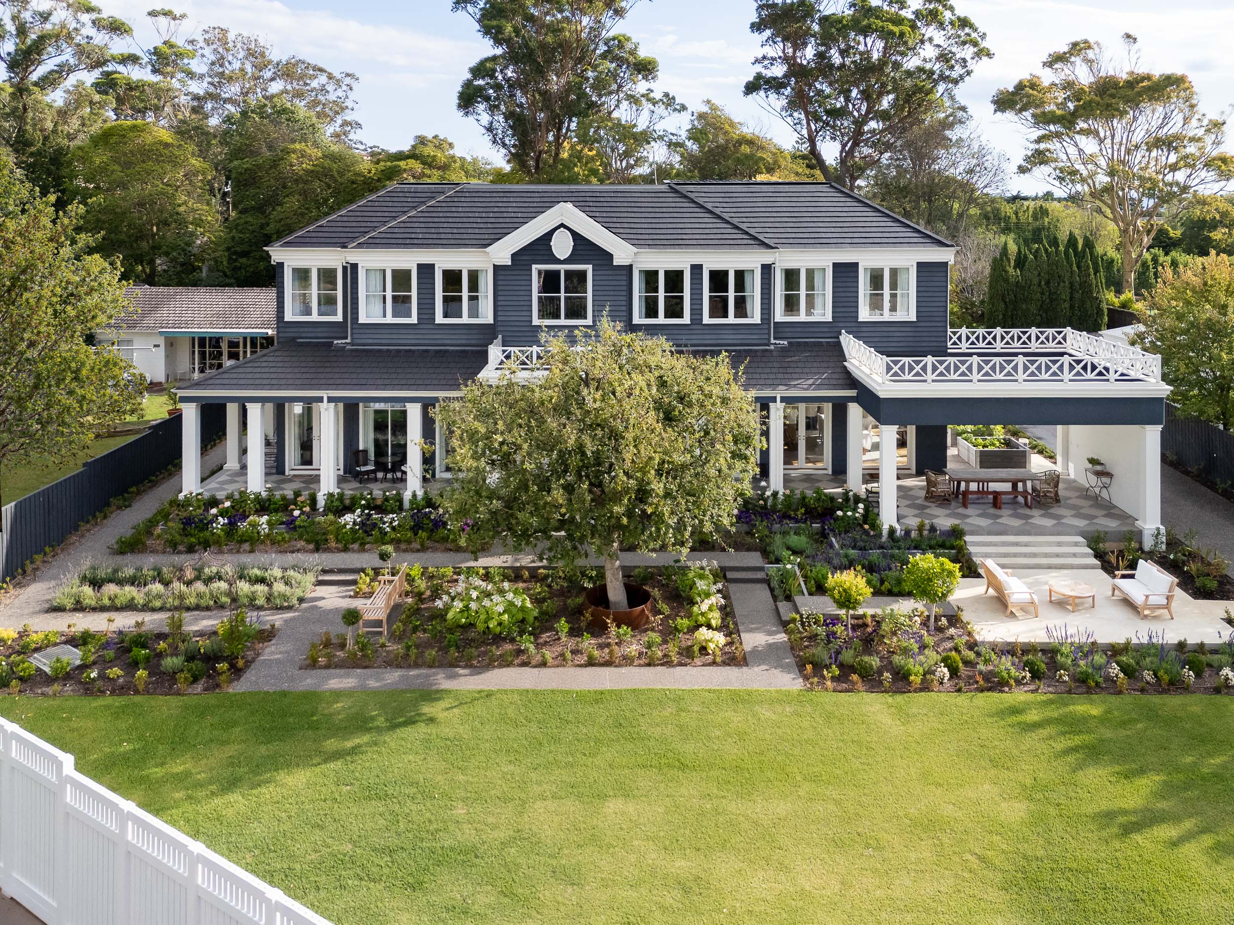 Positioned within a generous garden setting, the home presents a strong, balanced façade with deep verandahs, classical columns, and a considered material palette that sits comfortably within its coastal surroundings. The design allows for seamless indoor-outdoor connection, with multiple living zones opening onto landscaped terraces and entertaining areas.