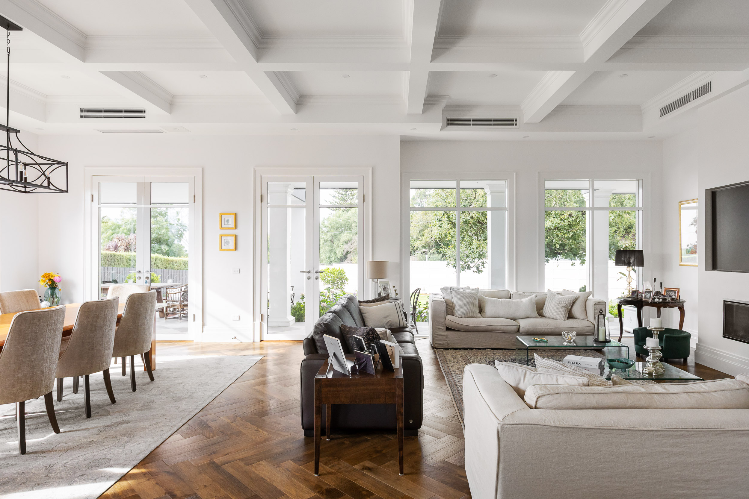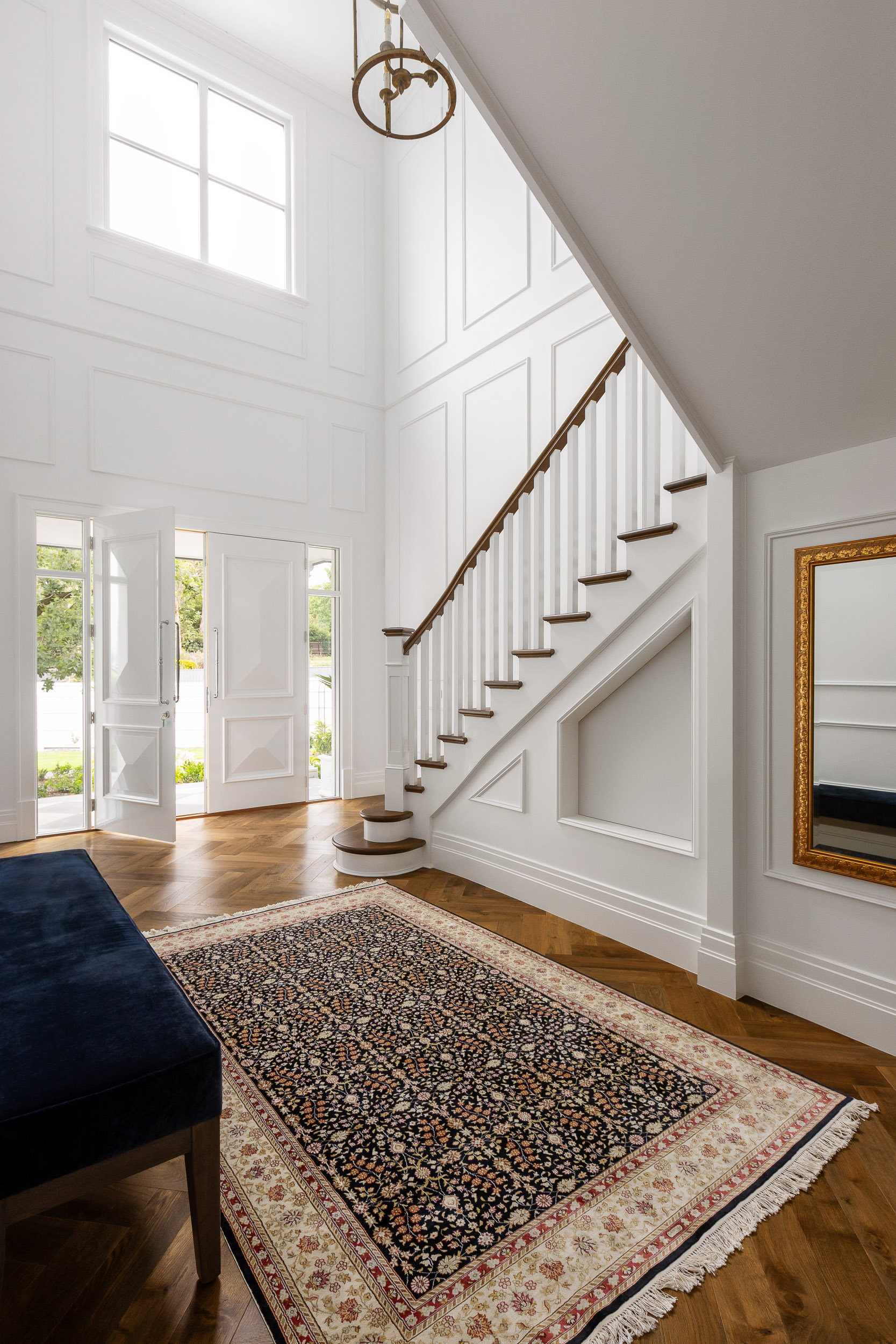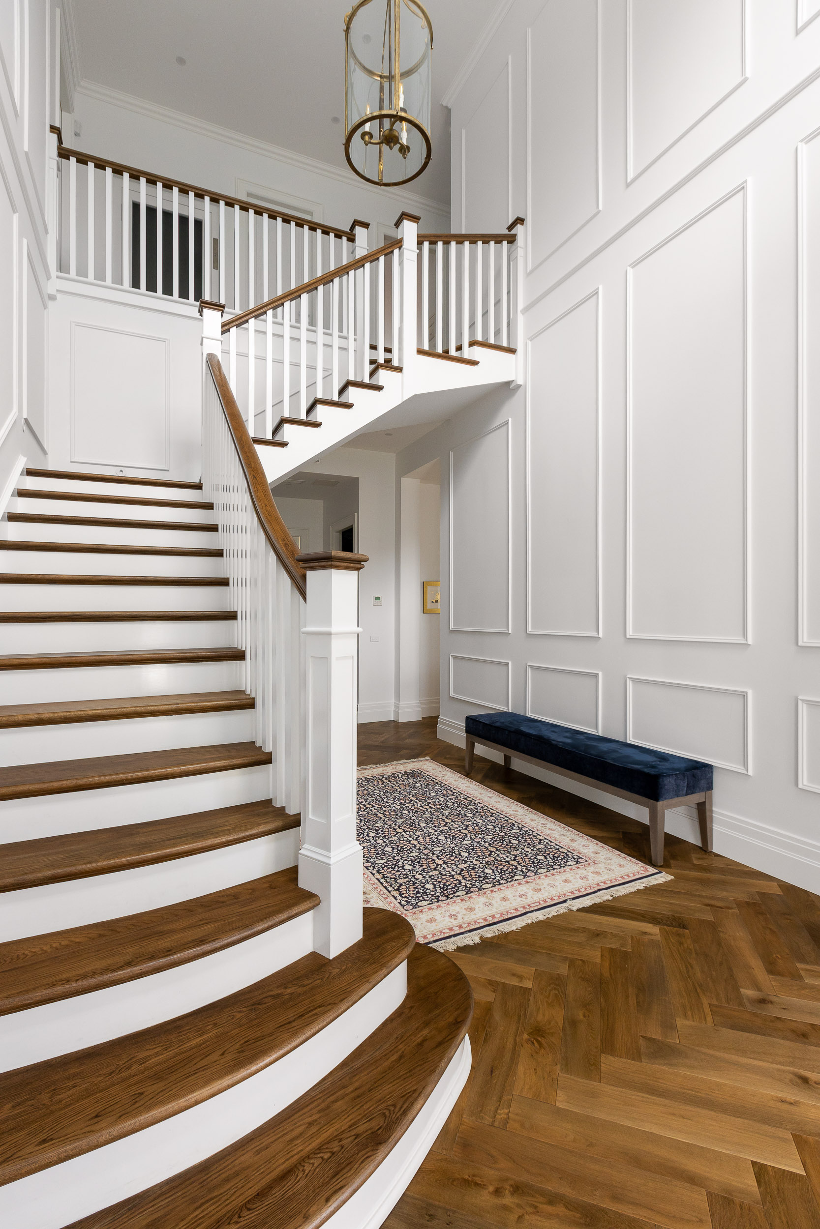 A refined material selection of natural stone, timber flooring, and detailed joinery adds warmth and longevity to the interiors. High ceilings, feature stair detailing, and carefully proportioned spaces enhance the sense of scale, while large windows invite natural light and frame views across the property.