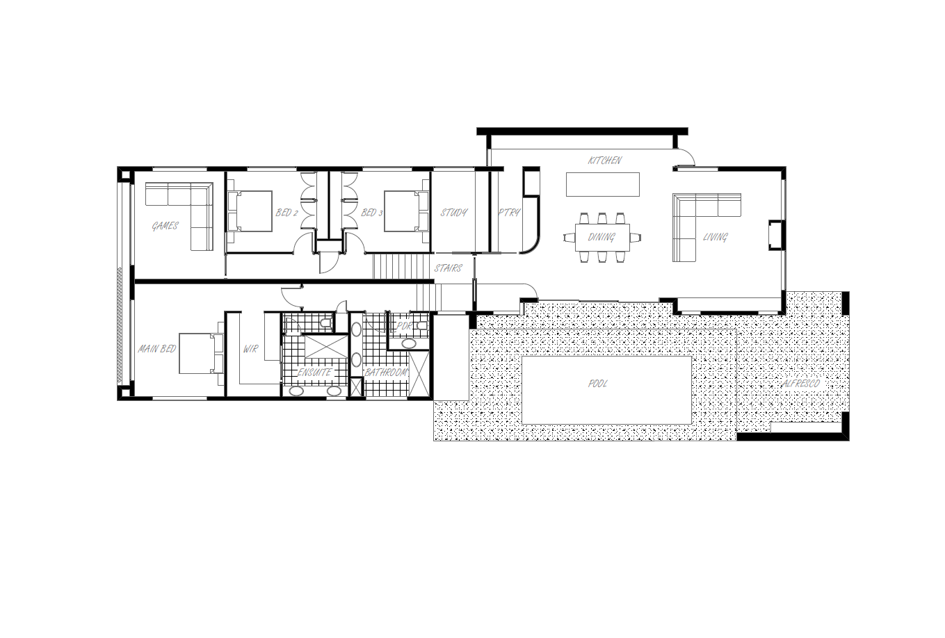 A refined response to urban family living, the Rosedale Residence embodies modernist design with thoughtful functionality. Spanning 47.5 squares, this split-level home makes full use of a sloping block, allowing for dynamic zoned living and a strong architectural presence.