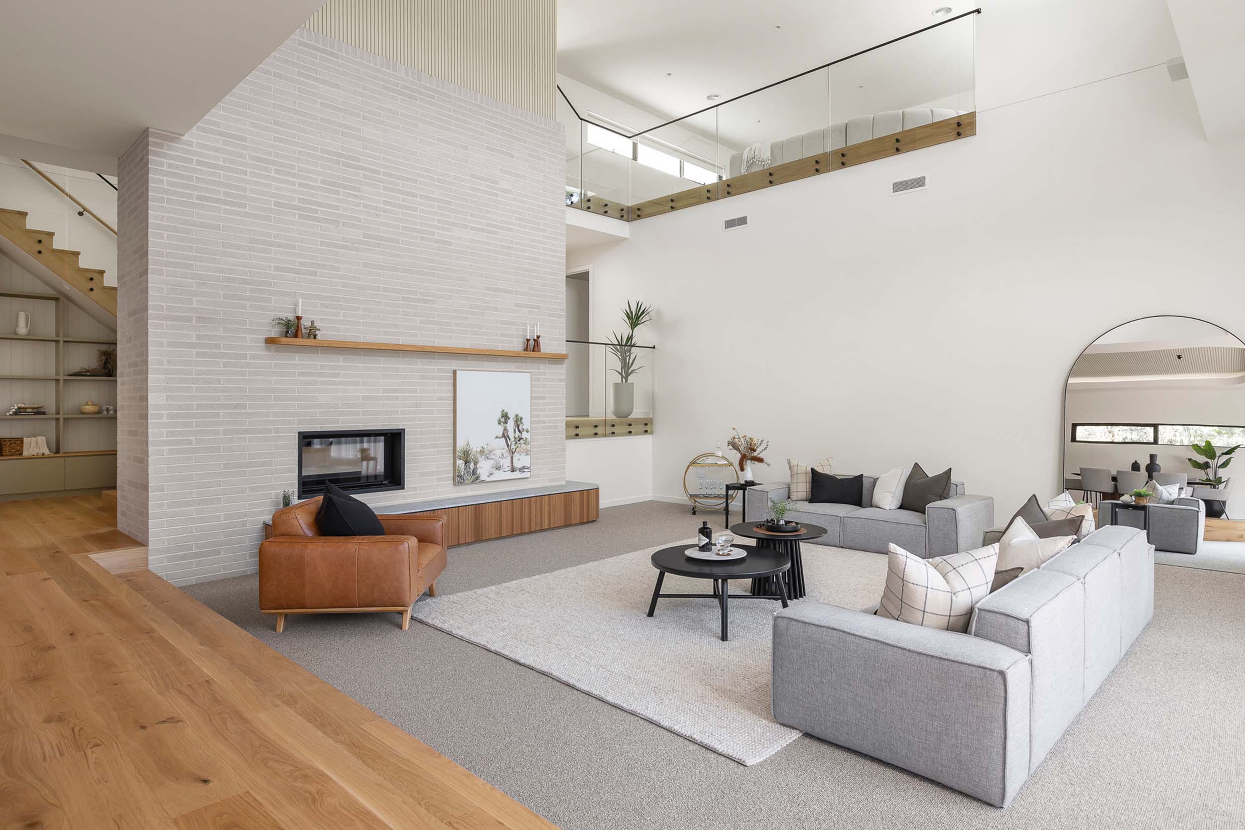 The Stoneridge Residence is a 60-square masterpiece of modern coastal living, thoughtfully designed to combine architectural impact with everyday functionality. This five-bedroom, 3.5-bathroom home includes a double garage and showcases a refined material palette of warm timbers, earthy green joinery, and feature brickwork. At its heart lies a dramatic sunken living space with a 7-metre ceiling and brick fireplace, connecting seamlessly to the open-plan kitchen and dining areas. Statement elements like curved timber batten detailing, recessed ceiling pelmets with LED lighting, and a striking glass-balustraded walkway elevate the design throughout. From the curved timber vanity in the ensuite to the custom joinery under the staircase, every detail has been carefully crafted to reflect a balance of style, comfort, and flow.